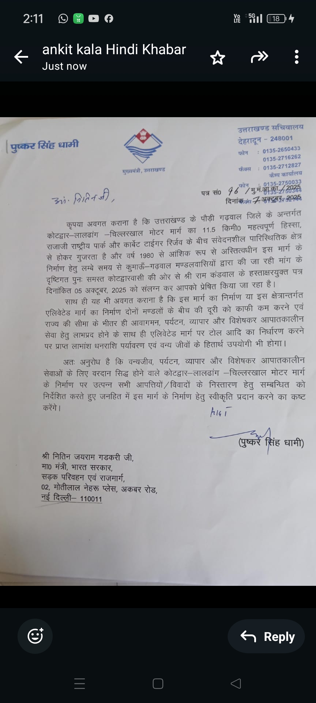 कोटद्वार लालढांग चिल्लर खाल मोटर मार्ग पर सीएम धामी ने लिया संज्ञान, नितिन गडकरी को पत्र लिखा – राम कंडवाल ने की थी मुलाकात